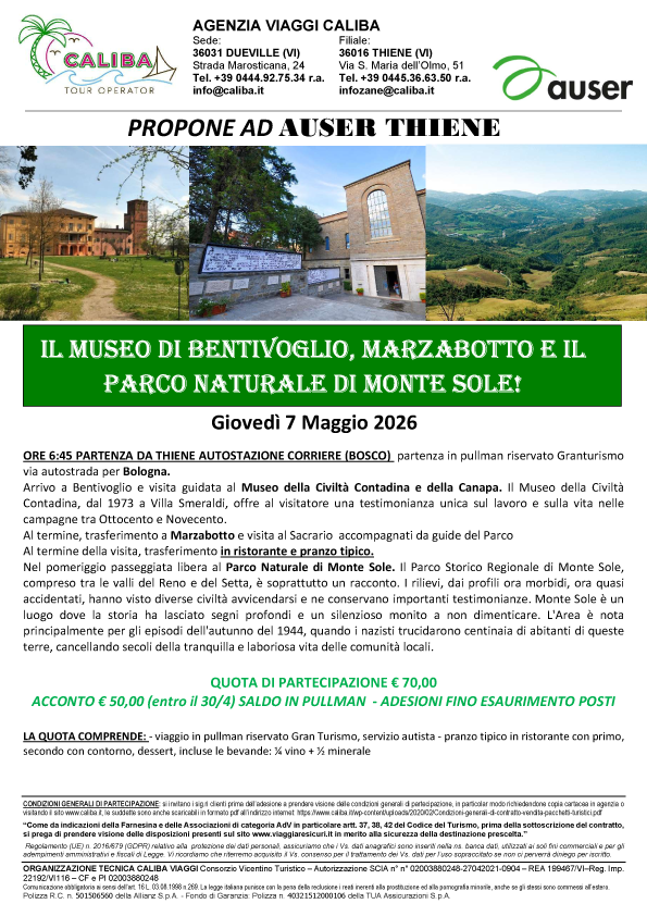 Visita guidata al Museo della Civiltà Contadina e della Canapa "G.Romagnoli" di Bentivoglio-Città Metropolitana di Bologna Prosecuzione per Marzabotto ( arrivo previsto alle ore !!:30 - 12 ) con accoglienza dell'Auser di Marzabotto. Visita guidata al Sacrario. Pranzo in locoPasseggiata ( probabilmente guidata)nel percorso Storico-Naturalistico del Parco Naturale di Monte Sole.L' escursione nel parco fino al Memoriale ha una durata di1,5 - 2 ore. Prevista auto a disposizione per chi non si sente di affrontare il percorso a piedi.Prevista anche la visita alla chiesa i Santa Maria Assunta di Casaglia per un incontro con la Comunità Scuola della Pace di Monte Sole Partenza per il ritorno alle ore 17-18 con tempo di percorrenza di 2 ore e mezza:.
